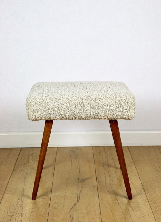 Taburete alto con asiento de bouclé beige y patas redondas de haya de los años 70.