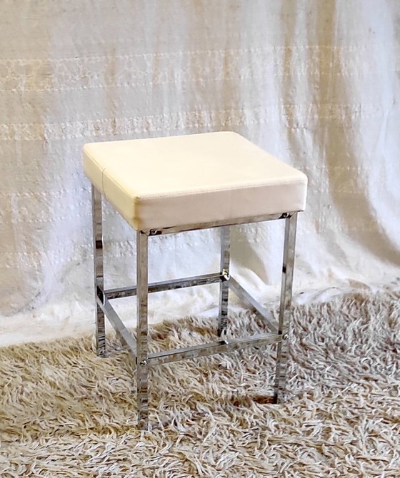 Taburete de diseño en metal cromado y polipiel blanca - mediados del siglo XX