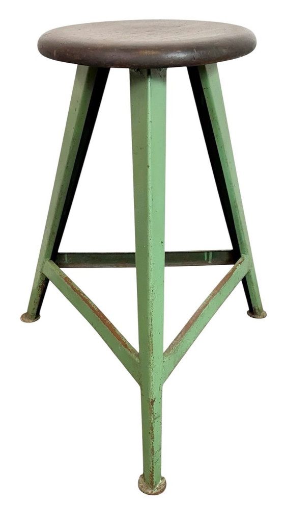 Taburete industrial vintage fabricado en la antigua Checoslovaquia durante la década de 1960. Cuenta con un asiento de madera y una estructura de metal verde. Pesa 4,7 kg. El diámetro del asiento es de 32 cm.