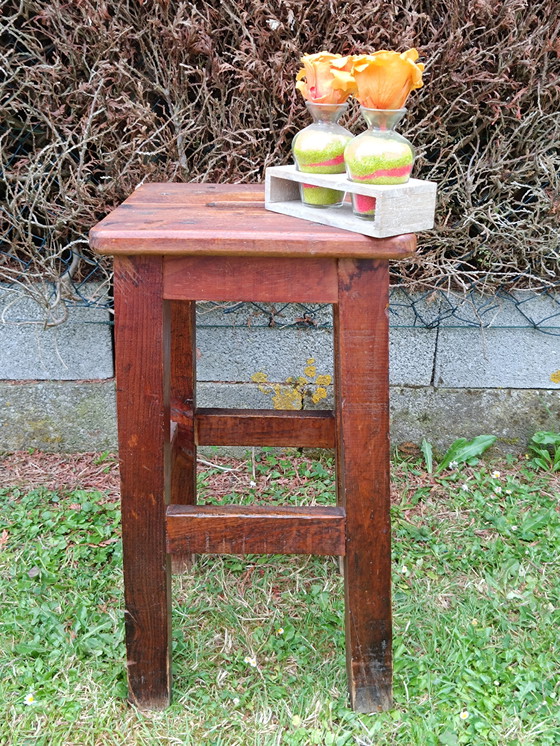 Taburete antiguo de madera maciza, hecho a mano, con cuatro patas cuadradas y sólidas. El asiento es grueso y cuenta con un asa central para facilitar su transporte. Sólido y estable, con pátina natural y algunas marcas de uso que le confieren carácter. Este taburete es ideal para una decoración rústica vintage o para uso práctico, como asiento, mesita auxiliar, etc. Altura: 58 cm, Ancho: 31 cm, Profundidad: 31 cm, Altura del asiento: 58 cm, Ancho del asiento: 31 cm, Peso: 4,740 kg.