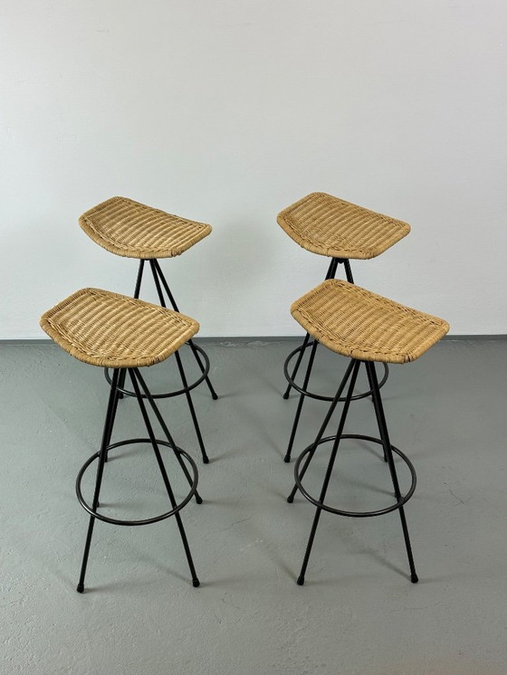 Juego de cuatro taburetes de bar italianos originales de la década de 1960, con estructura de acero lacado en negro y asientos de ratán tejido a mano. Elegante diseño de mediados de siglo con una silueta ligera y gráfica y un reposapiés circular.
