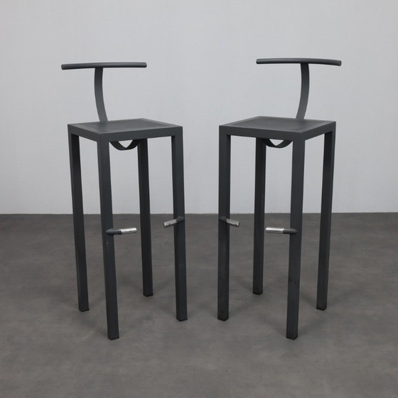 Un impactante par de taburetes de bar Sarapis diseñados por Philippe Starck para Aleph Driade en 1986. Estos esculturales taburetes ejemplifican el enfoque radical de Starck hacia el diseño posmoderno, donde convergen la claridad gráfica, la ironía y la estructura arquitectónica.