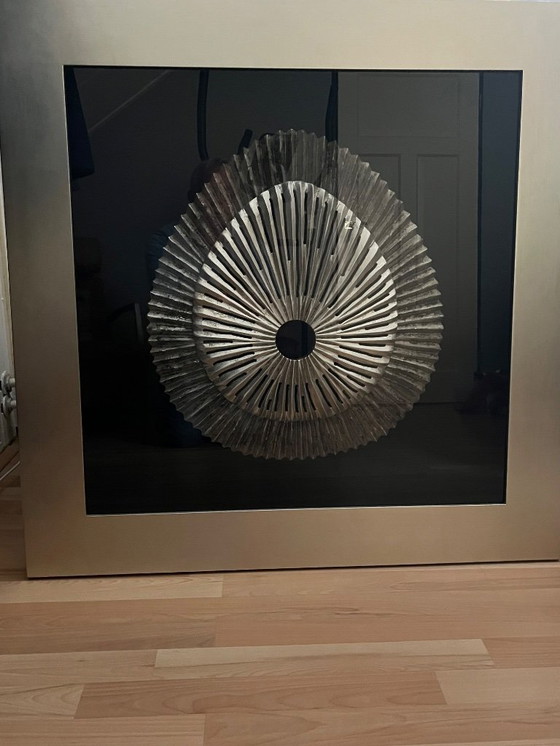 Talla de madera detrás de un cristal. Montado sobre lienzo de terciopelo negro. Marco ancho y pesado de 90 x 90 cm. 5 cm de profundidad.