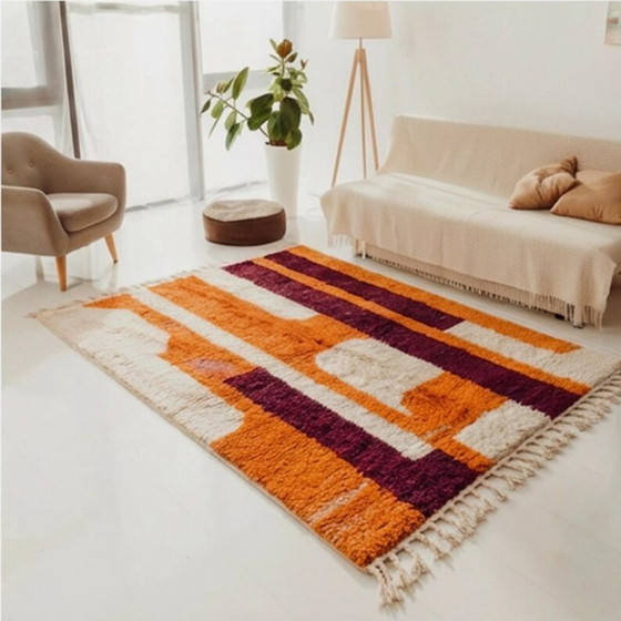Sumérgete en las ricas texturas y los vibrantes colores de esta auténtica alfombra de lana bereber. Con unas medidas de 200 x 150 cm, esta exquisita pieza aporta un toque de calidez y elegancia a cualquier estancia con sus llamativos diseños geométricos en naranja, morado y blanco.