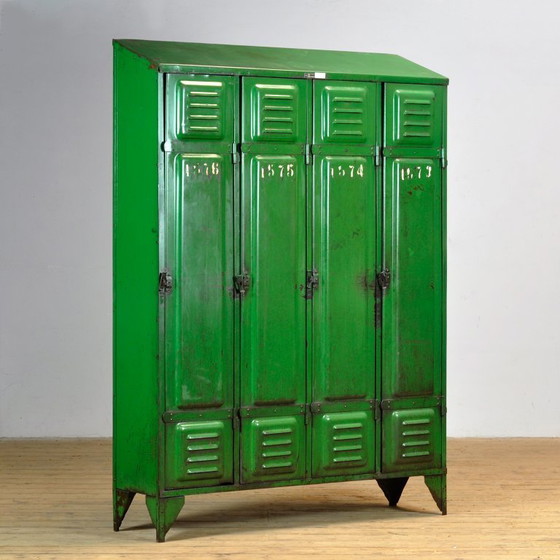 Esta taquilla, fabricada en Francia alrededor de 1950, cuenta con cuatro compartimentos para guardar todas sus pertenencias. En la parte superior hay un estante y en la inferior, ganchos para ropa. Su color verde combina con cualquier estilo. Su aspecto rústico y desgastado evoca su historia y carácter. Acabado con aceite antioxidante.