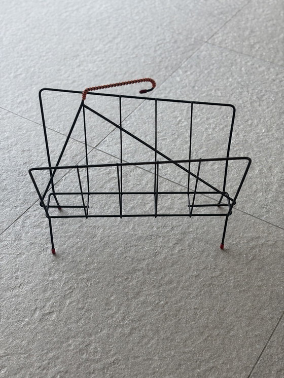 Este es un revistero vintage de la década de 1950, con un diseño clásico Mid Century Modern. Está fabricado en metal resistente con un elegante acabado en negro y detalles en rojo. El revistero es a la vez funcional y elegante, perfecto para organizar revistas o periódicos en un salón o un despacho. Su diseño minimalista y su robusta construcción lo convierten en una pieza atemporal que complementa varios estilos de interior.