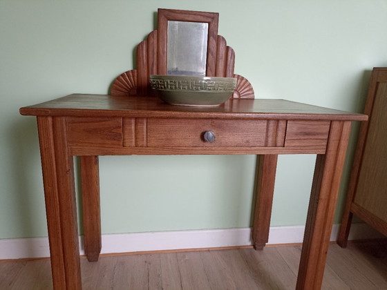 Un hermoso tocador Art Déco de roble. Un magnífico espejo desgastado. Un documento único de tiempo y lugar: un almanaque de 1941 en la parte posterior. Originario del sur de Francia. En perfecto estado.
