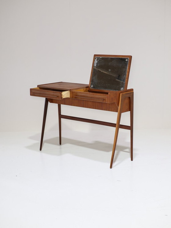 Precioso tocador vintage danés de los años 60. Este pequeño escritorio/tocador está hecho de madera de teca. Su diseño es elegante, con formas y detalles únicos. Aunque parece tener dos cajones, en realidad solo tiene uno a la izquierda y un espejo plegable a la derecha, con amplio espacio de almacenamiento debajo para maquillaje, joyas, etc.