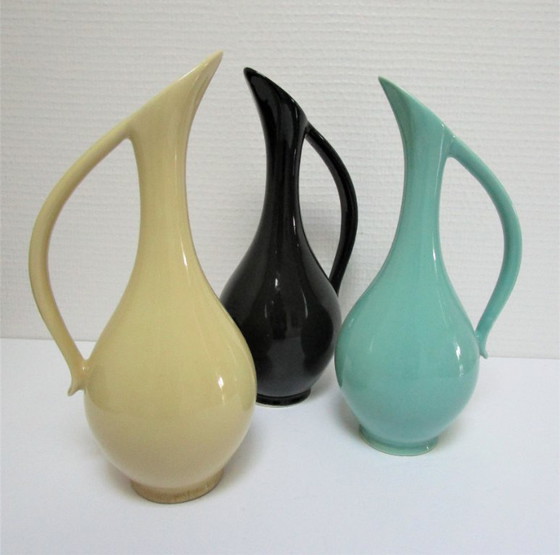 Aunque son muy similares, las tres jarras tienen una altura ligeramente diferente: 24,5 cm la verde celadón, 25 cm la negra y 25,5 cm la amarilla pálido.