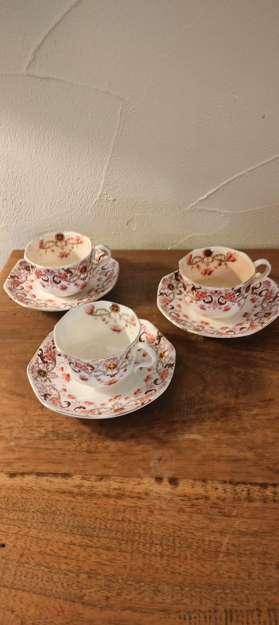 Tres tazas y platillos británicos de la colección de 1893-1894, octogonales, estilo Reina Ana.