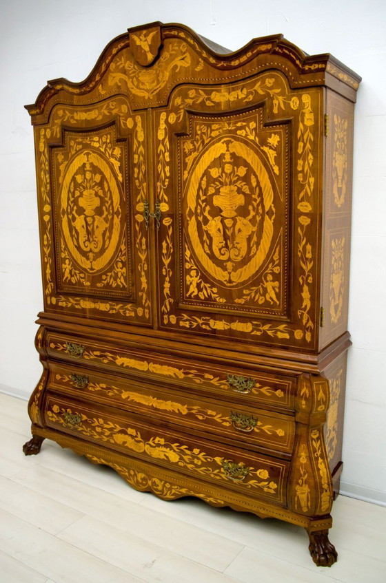 Trumeau holandés de mediados del siglo XX. Mueble de calidad excepcional, ricamente incrustado en madera de nogal y arce, el interior está revestido de caoba y la estructura del mueble es de abeto macizo. Trumeau de doble cuerpo para salón, sala de estar o gran estudio con 3 grandes cajones exteriores. Parte superior dos puertas y dos cajones interiores con estante. Las puertas también tienen incrustaciones en el interior, (ver foto). Mueble con encanto, para anticuarios y decoradores de interiores, en buen estado, parcialmente restaurado y pulido con goma laca.