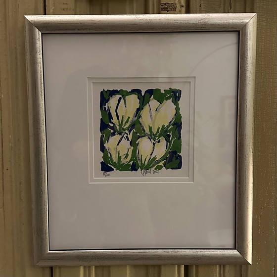 Impresión 87 de una serie de 100. La imagen en sí es de 15x15cm. El marco mide 34.5x38.5cm. Ad van Hassel nació en Roosendaal el 26 de abril de 1953. Comenzó a pintar en 1980. Después de años de vagabundeo creativo, abrió dos galerías exclusivas en los hoteles Sonesta y Krasnapolsky de Ámsterdam en 1983. Sus pinturas de tulipanes son su obra más conocida. En 1990, Van Hassel comenzó a producir serigrafías de sus pinturas. Alcanzó tal alta calidad que otros artistas pronto comenzaron a tener su trabajo serigrafiado por él. Por ejemplo, fue impresor de la casa de Herman Brood durante 12 años. Corneille, Jan Cremer, Rob Scholte, Shunyam, Peter Diem y muchos otros artistas también utilizaron con frecuencia su experiencia.