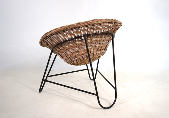 Esta silla de ratán está en buen estado. El mimbre está intacto y es sólido. El armazón de metal plastificado negro presenta algunos desconchones y signos de desgaste. Las sillas han adquirido una hermosa pátina con el paso de los años. La carcasa cónica del asiento proporciona un cómodo asiento. El asiento de mimbre se inserta en la estructura metálica y es fácilmente apilable.