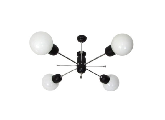 Elegante lámpara de los años 70, fabricada en metal y cristal. En muy buen estado. Perfecta para interiores retro, vintage o industriales. Requiere 4 bombillas E14.