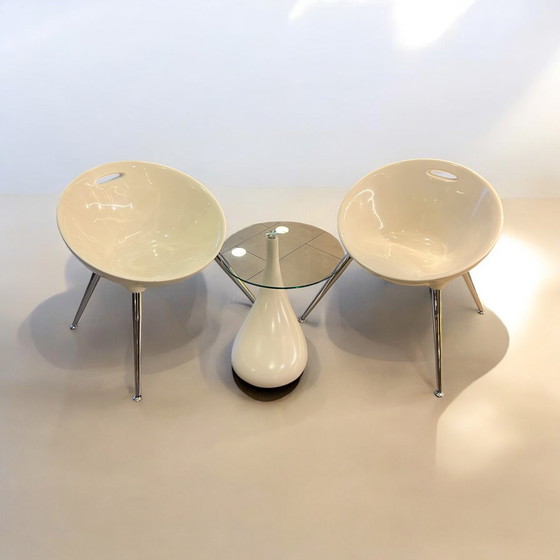 Este conjunto de tres piezas, dos sillones de media concha y una mesa auxiliar, son piezas de exhibición, de las cuales solo la mesa auxiliar se comercializó en grandes cantidades. Esto significa que los sillones son únicos. En dos imágenes, los sillones parecen amarillentos, pero son de un blanco puro, al igual que la mesa. El precio corresponde al conjunto completo. Presumiblemente de Kare Design. Dimensiones de los sillones: ancho 64 cm, fondo 61 cm, alto 69 cm, altura del asiento 42 cm. Dimensiones de la mesa con forma de gota: diámetro 45 cm, alto 53 cm.