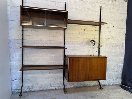 Mueble de pared modular de la serie Urio, diseñado por Ico Parisi para MiM Roma en la década de 1960. Consta de tres montantes metálicos, un armario con hermosas puertas correderas, una vitrina y tres estantes de palisandro. La madera envejecida tiene un carácter profundo que aporta calidez a cualquier interior moderno. A diferencia de otros modelos, este armario no necesita montaje en el techo, lo que lo hace ideal para una mayor variedad de espacios. El mueble presenta signos de desgaste propios de su antigüedad. Una de las puertas de cristal está desportillada, como se muestra en las fotos.