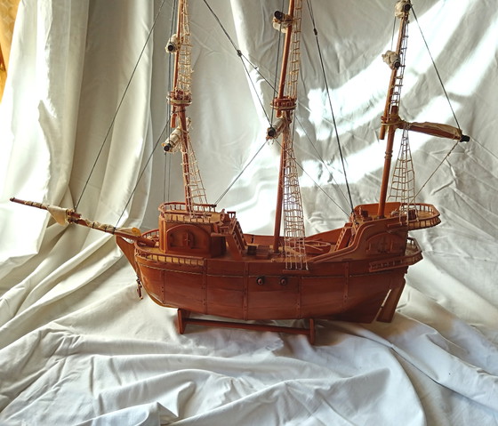 Esta magnífica embarcación artesanal de la década de 1980 es una obra de arte que evoca la elegancia y la artesanía de una época pasada. Elaborada con cuidado y atención al detalle, esta maqueta de madera es un homenaje a la tradición naval y una encantadora adición a cualquier colección.