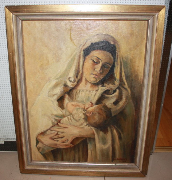 Virgen con el Niño - Pintura al óleo original firmada por Hillers