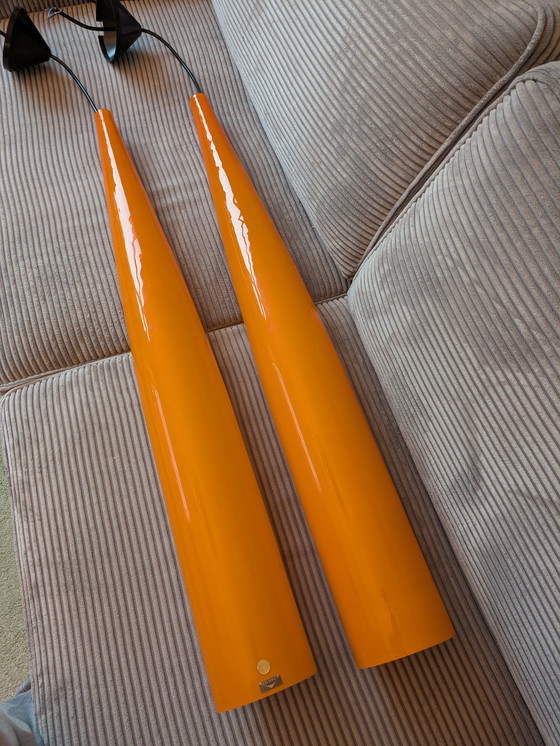 Lámparas colgantes vintage de los años 60 en estado casi impecable. A una de ellas le faltan las etiquetas de la marca, y en ambas se han reemplazado los cables y las tapas del techo. Por lo demás, son completamente originales y están en perfecto estado.