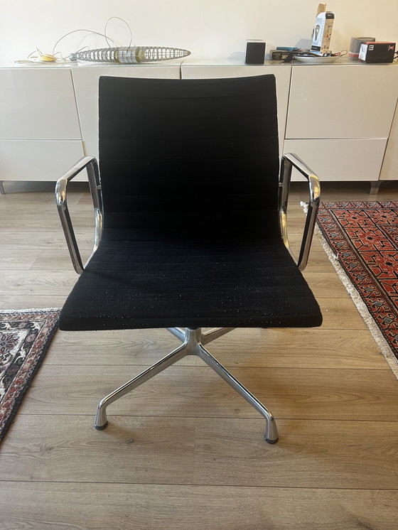 Presentamos la silla Vitra Eames 108, una pieza atemporal que combina a la perfección funcionalidad con un diseño icónico. Esta silla giratoria, fabricada por la reconocida marca Vitra, encarna la elegancia e innovación del estilo Mid Century Modern. Su elegante asiento textil negro se complementa con una robusta estructura metálica, que ofrece comodidad y durabilidad.