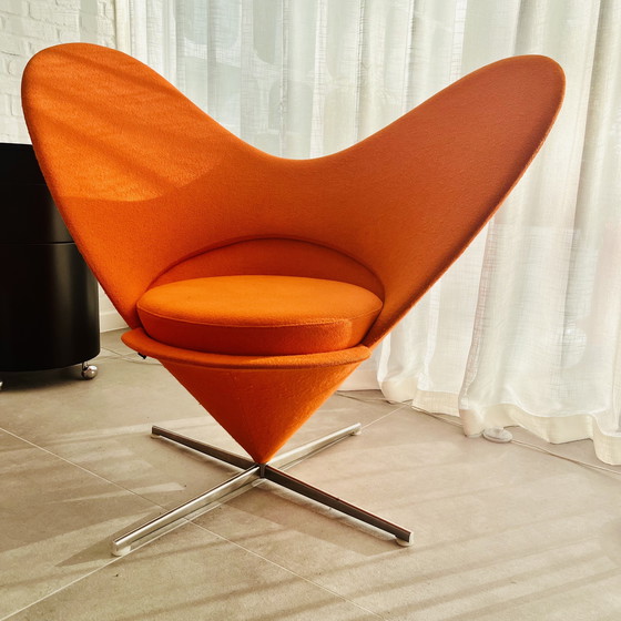 Introducing the Vitra Heart Cone Chair, a striking piece designed by the renowned Verner Panton. This chair is a testament to modern design, featuring a bold and vibrant orange hue that commands attention in any setting. Its unique heart-shaped backrest not only adds a touch of whimsy but also provides exceptional comfort, making it a perfect addition to contemporary interiors.