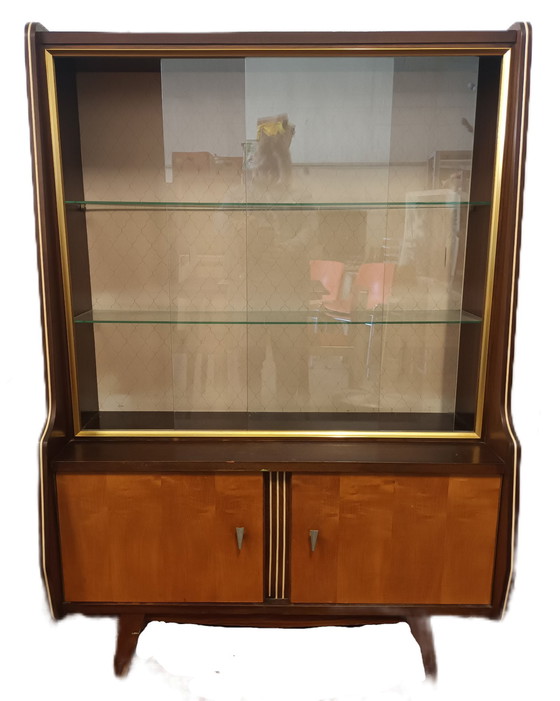 Vitrina o aparador alto vintage de los años 50 o 60. Presenta un distintivo diseño de mediados de siglo (estilo moderno de mediados de siglo), con puertas correderas de cristal en la parte superior, detalles dorados y patas angulares.