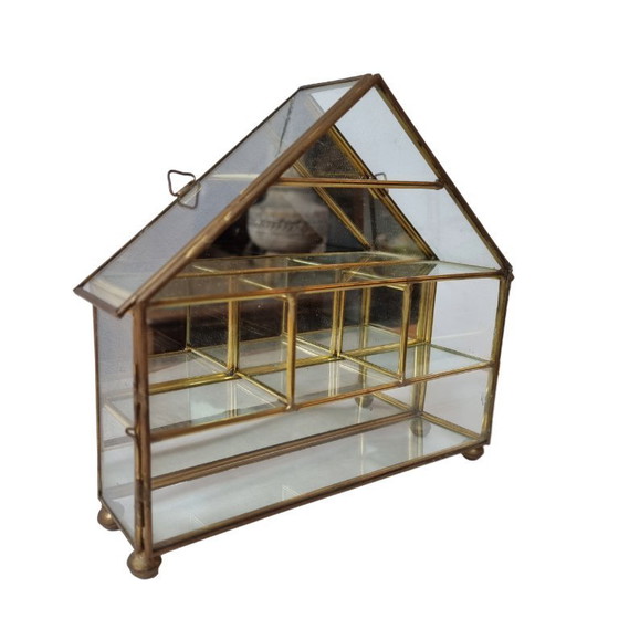 Preciosa vitrina de latón de la época de la Regencia de Hollywood, década de 1970. Tiene una forma única y se puede colgar del sistema de suspensión adjunto o utilizar de pie. La puerta sigue funcionando perfectamente. Un poco de pátina aquí y allá en el latón y un pequeño trozo de latón está pegado, el vidrio es absolutamente perfecto. Fue fabricado en Francia y no está marcado.