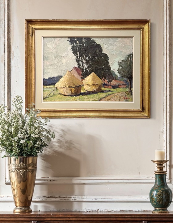 Esta pintura es un vívido ejemplo de la tradición postimpresionista flamenca de mediados del siglo XX. El artista captura con maestría el ritmo del paisaje rural mediante pinceladas audaces y dinámicas y una paleta rica y luminosa.