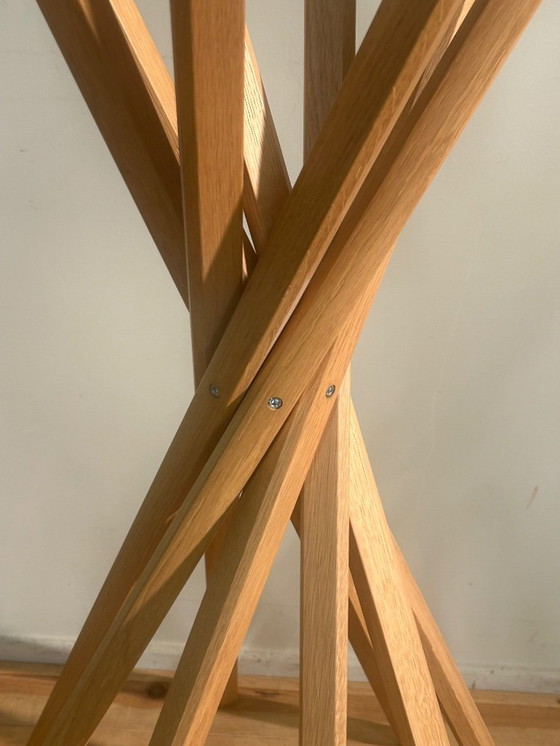 El perchero Zanotta Scianga 300 fue diseñado por el estudio de diseño DDL para la marca italiana Zanotta. Este singular perchero data de 1973 y es uno de sus diseños más famosos. En 1979, ganó el prestigioso premio Compasso d'Oro. El perchero Sciangai 300 es un diseño típico donde forma y función se complementan. Consiste en un manojo de varillas individuales unidas por el centro. El perchero se asemeja a un manojo de varillas de Mikado a punto de deshacerse. Esto lo convierte en una obra de arte decorativa única. Desplegado, el perchero Sciangai mide 145 cm de alto y 65 cm de diámetro, y es muy estable. Si es necesario, se puede plegar total o parcialmente para ahorrar espacio. * Marca: Zanotta * Diseño: De Pas, D'Urbino, Lomazzi - 1973 * Dimensiones cerrado: Al 160 cm x An 11 cm * Dimensiones abierto: Al 145 cm x An 65 cm * Material: Madera de fresno lacada