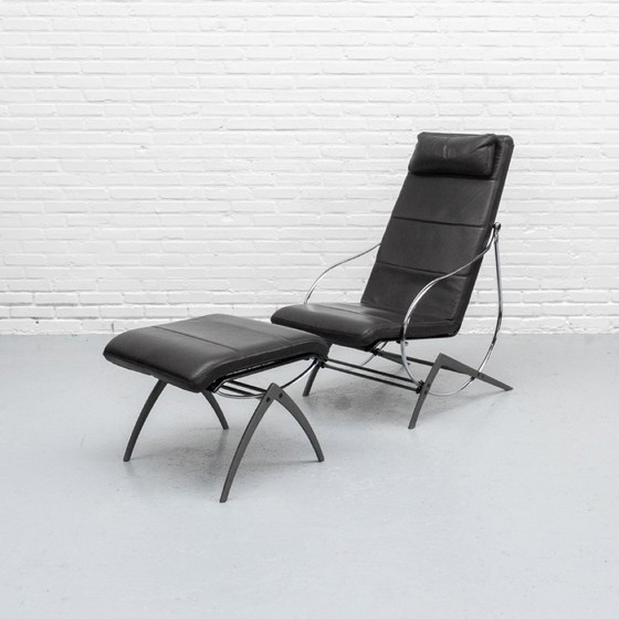 Diseñado en 1987 por Gianfranco Gualtierotti y Mazzoni Delle Stelle, y producido durante un breve periodo en 1988 por Zanotta, Italia. Este sillón reclinable ajustable tiene una base de metal fundido combinada con un armazón tubular cromado. El tapizado es de cuero marrón oscuro.