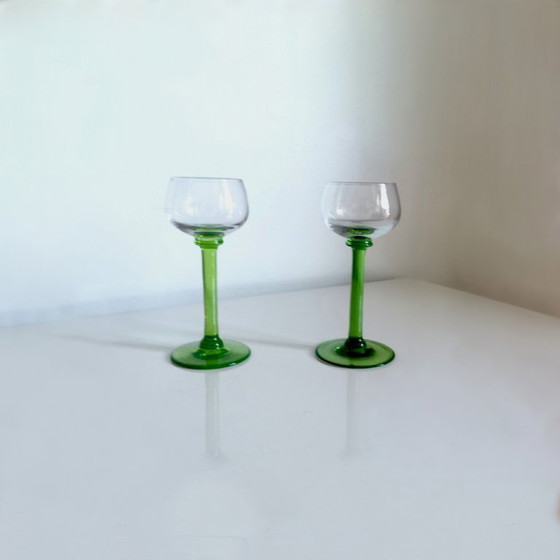 Dos copas antiguas de fino cristal francés con base verde. El color verde se obtiene añadiendo dióxido de uranio al cristal. Este elemento hace que el cristal se vuelva verde neón bajo la luz ultravioleta. Dimensiones: 12x4,5 cm. Hay una abolladura insignificante en uno de los pies (véase la foto).