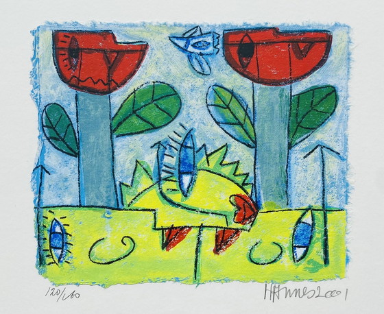 Una alegre y colorida serigrafía del artista Hannes Kuiper. La serigrafía está en perfecto estado y firmada a mano por el artista. Nota: El número de edición puede ser diferente al de la foto. El marco es exactamente igual y nuevo. Hannes Kuiper (nacido en 1945) es un pintor, músico y artista neerlandés de la vida. Sus pinturas son reconocibles al instante. Su música nace desde la primera nota. Sus poemas capturan la vida en pocas frases. Y, en palabras del propio Hannes: "Al final, todo es cuestión de imaginación". Las pinturas de Kuiper suelen estar llenas de pájaros coloridos, nubes, vacas y, por supuesto, el sol. Es una obra que te alegrará el día. Echa un vistazo también a nuestros otros artículos de la Galerie Rotor en Whoppah o contáctanos para que te asesoremos. ¿Te gustaría enmarcar la obra? En la Galerie Rotor, nos encargamos de todas tus necesidades de enmarcado. Puedes recoger la obra en la galería o enviarla por correo certificado.
