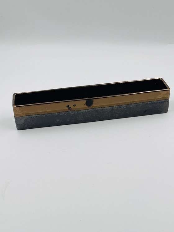 Dale un toque de elegancia a tu hogar con esta maceta rectangular. Su diseño elegante y estética moderna la convierten en el complemento perfecto para cualquier espacio contemporáneo. La combinación de tonos dorados y negros crea un contraste impactante que realza su atractivo visual. Fabricada en cerámica de alta calidad, esta pieza es resistente y elegante. Ideal para exhibir tus plantas favoritas o como pieza decorativa independiente, aporta un toque sofisticado a cualquier estancia. No pierdas la oportunidad de realzar tu decoración con esta maceta única. En muy buen estado. Dimensiones: 35 x 6 x 6 cm de alto.