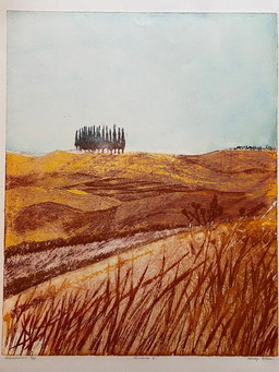Margo Ellen - Toscana. Cipreses. Grabado a color.