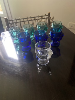 Juego de vasos de chupito con soporte de metal, década de 1950