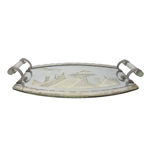 Bandeja de servicio ovalada de vidrio y latón, finales del siglo XIX y principios del XX.