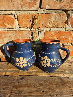 Set van 7 aardewerken kopjes, 5 schotels en 1 melkkan. Gemerkt met afbeelding van een springend hert en het woord 'Holland'.