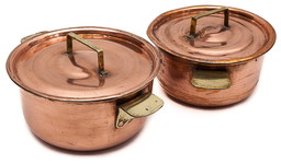 Cacerolas de cobre, juego de dos, marcadas made in Portugal, 1980.