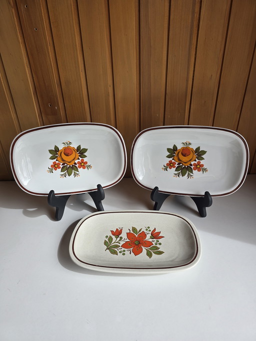 Juego de 4 platos Waechtersbach SNACK PLATTERS para verduras, de cerámica con inserto de madera, años 50 y 60.