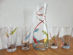 Colorido juego de vasos y jarra, Scherzer Bavaria, años 80, fabricado en Alemania.