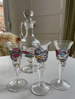 Jarra y 8 vasos pintados a mano de los años 50