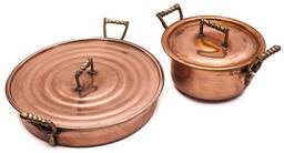 Ancienne batterie de casseroles en cuivre, fin du 19e siècle.