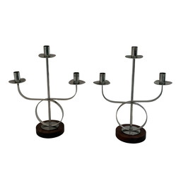 Ensemble de deux candélabres à trois bougies chacun, en bois de teck et métal chromé, vers 1970, de style scandinave.