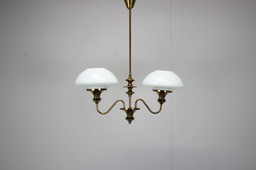 Lustre Scandinave huit feux, teck, laiton et opaline, Mid-Century