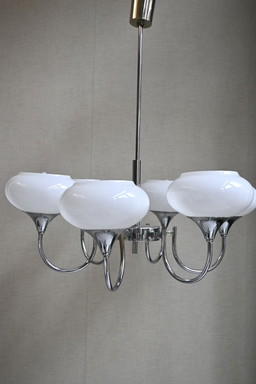 Superbe lustre Art déco années 50 – chrome & opaline rose pale Superbe lustre Art déco années 50 – chrome & opaline rose pale