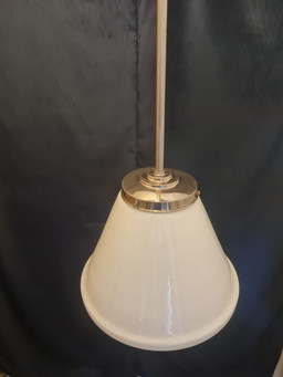 Lampe suspendue vintage en verre givré blanc avec fixation en métal blanc, lampe mcm, lampe d'école en verre