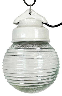 Suspension vintage en porcelaine blanche avec verre côtelé, années 1970Suspension vintage en porcelaine blanche avec verre côtelé, années 1970