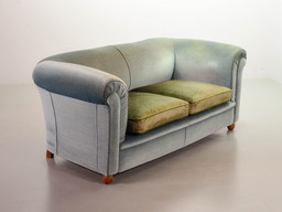 Chesterfield Duotone canapé victorien à deux places en velours bleu mat et vert mousse, années 1950. ref SS058