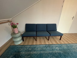 Canapé 3 places danois des années 1950, revêtement en velours, bois de frêne sculpté.