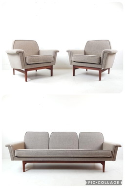 Ensemble canapé vintage en bois de teck | canapé + 2 fauteuils beige laine De Ploeg